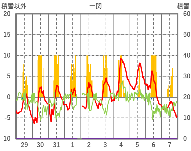 | 日 | 時 | 気温 | 降水 | 風向/風速 | 日照 | 積雪 | 降雪 |