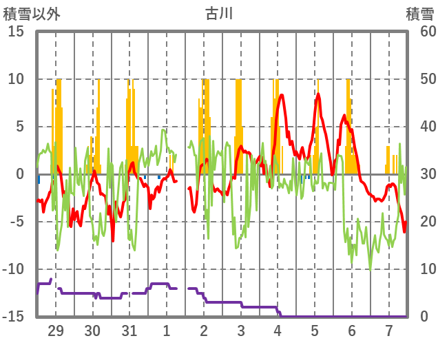 | 日 | 時 | 気温 | 降水 | 風向/風速 | 日照 | 積雪 | 降雪 |