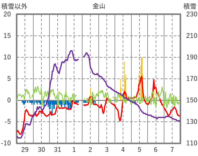 | 日 | 時 | 気温 | 降水 | 風向/風速 | 日照 | 積雪 | 降雪 |