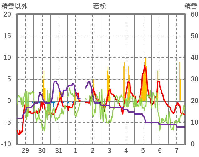 | 日 | 時 | 気温 | 降水 | 風向/風速 | 日照 | 積雪 | 降雪 |