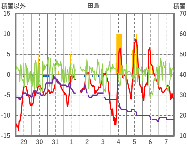 | 日 | 時 | 気温 | 降水 | 風向/風速 | 日照 | 積雪 | 降雪 |