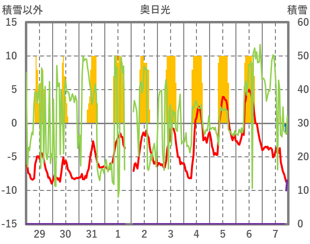 | 日 | 時 | 気温 | 降水 | 風向/風速 | 日照 | 積雪 | 降雪 |