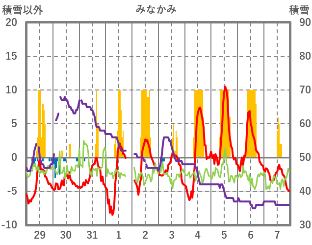 | 日 | 時 | 気温 | 降水 | 風向/風速 | 日照 | 積雪 | 降雪 |