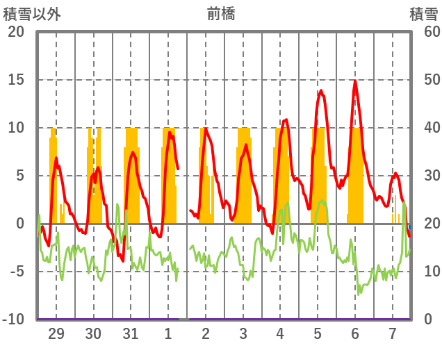 | 日 | 時 | 気温 | 降水 | 風向/風速 | 日照 | 積雪 | 降雪 |