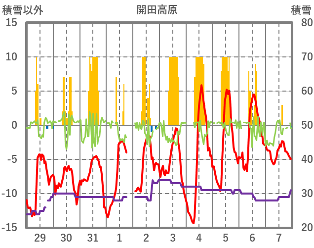 | 日 | 時 | 気温 | 降水 | 風向/風速 | 日照 | 積雪 | 降雪 |