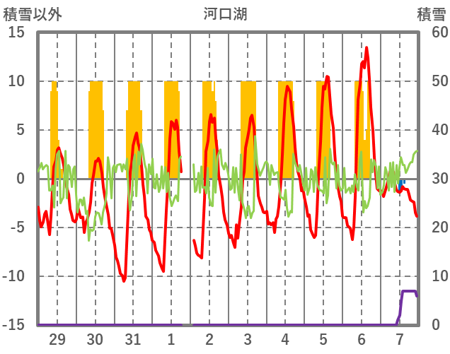 | 日 | 時 | 気温 | 降水 | 風向/風速 | 日照 | 積雪 | 降雪 |