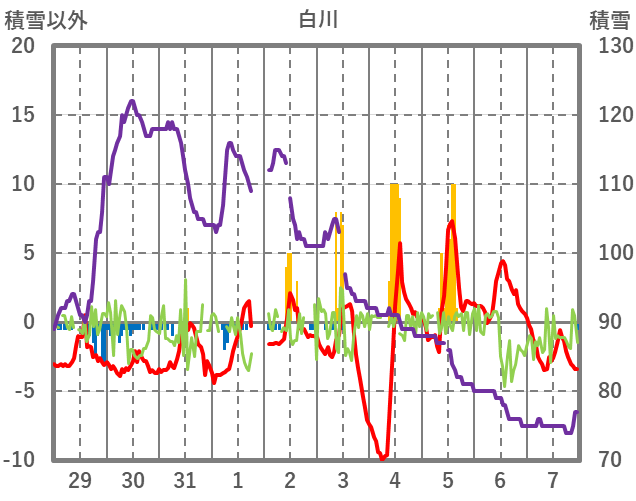 | 日 | 時 | 気温 | 降水 | 風向/風速 | 日照 | 積雪 | 降雪 |