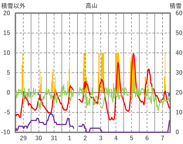 | 日 | 時 | 気温 | 降水 | 風向/風速 | 日照 | 積雪 | 降雪 |