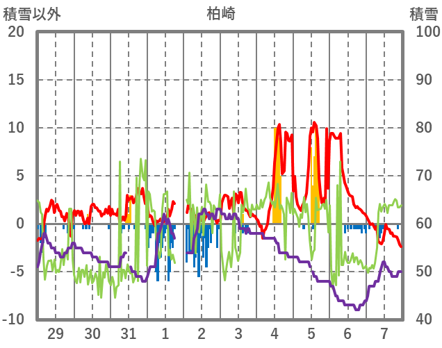 | 日 | 時 | 気温 | 降水 | 風向/風速 | 日照 | 積雪 | 降雪 |