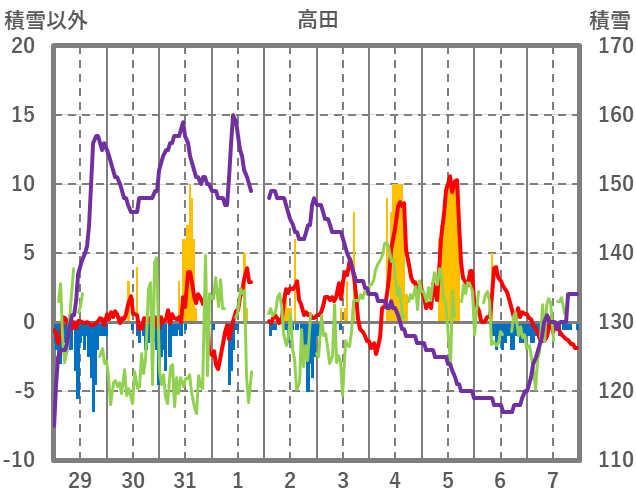 | 日 | 時 | 気温 | 降水 | 風向/風速 | 日照 | 積雪 | 降雪 |