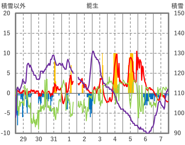 | 日 | 時 | 気温 | 降水 | 風向/風速 | 日照 | 積雪 | 降雪 |