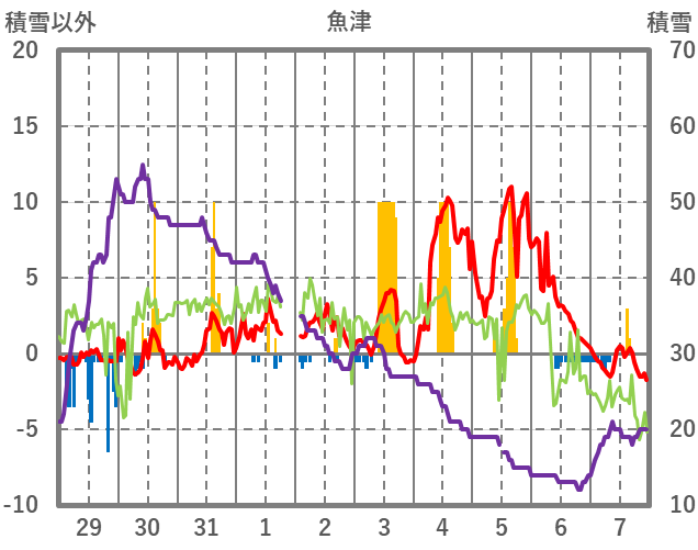 | 日 | 時 | 気温 | 降水 | 風向/風速 | 日照 | 積雪 | 降雪 |