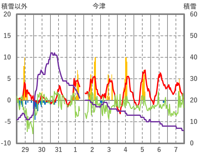 | 日 | 時 | 気温 | 降水 | 風向/風速 | 日照 | 積雪 | 降雪 |
