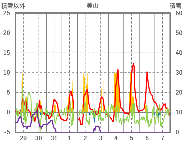 | 日 | 時 | 気温 | 降水 | 風向/風速 | 日照 | 積雪 | 降雪 |