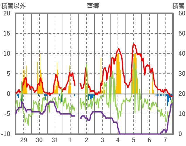 | 日 | 時 | 気温 | 降水 | 風向/風速 | 日照 | 積雪 | 降雪 |