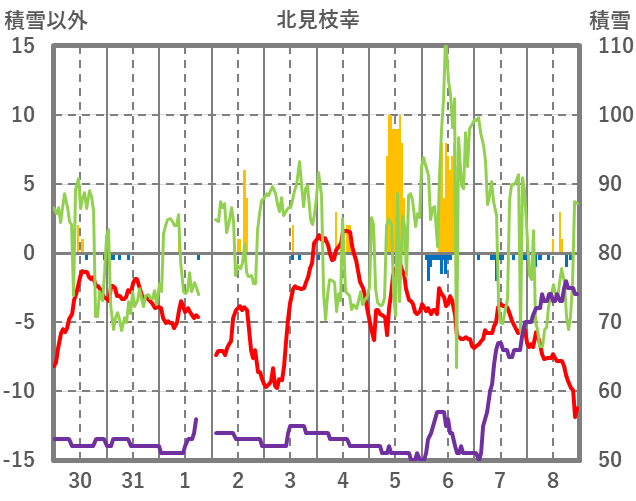 | 日 | 時 | 気温 | 降水 | 風向/風速 | 日照 | 積雪 | 降雪 |