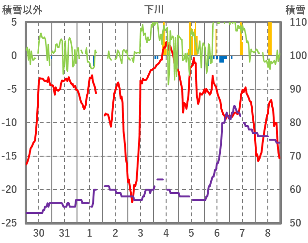 | 日 | 時 | 気温 | 降水 | 風向/風速 | 日照 | 積雪 | 降雪 |