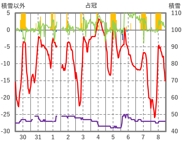 | 日 | 時 | 気温 | 降水 | 風向/風速 | 日照 | 積雪 | 降雪 |