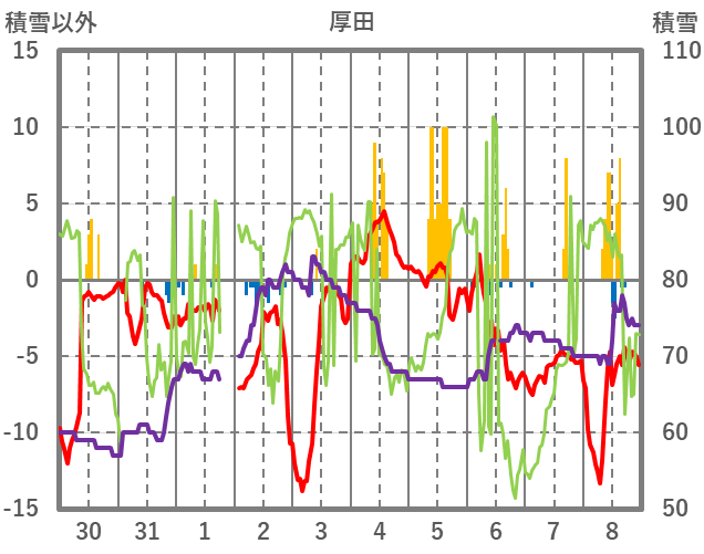 | 日 | 時 | 気温 | 降水 | 風向/風速 | 日照 | 積雪 | 降雪 |
