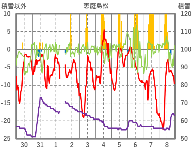 | 日 | 時 | 気温 | 降水 | 風向/風速 | 日照 | 積雪 | 降雪 |