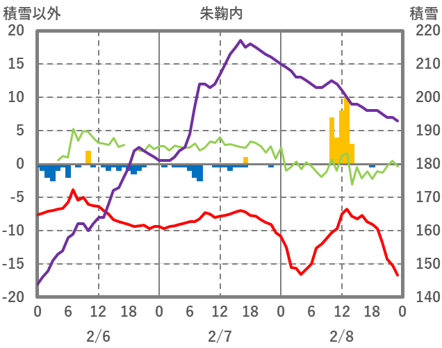 | 日 | 時 | 気温 | 降水 | 風向/風速 | 日照 | 積雪 | 降雪 |