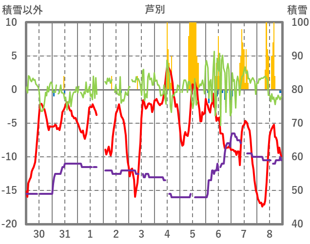 | 日 | 時 | 気温 | 降水 | 風向/風速 | 日照 | 積雪 | 降雪 |