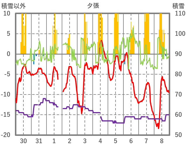 | 日 | 時 | 気温 | 降水 | 風向/風速 | 日照 | 積雪 | 降雪 |