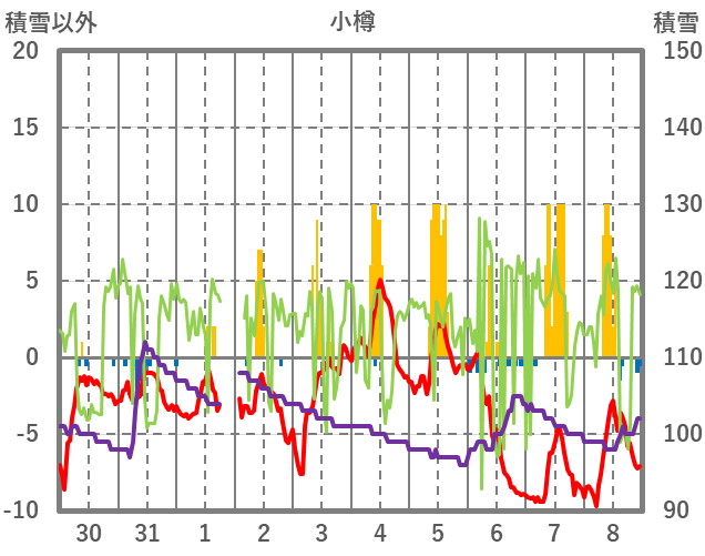 | 日 | 時 | 気温 | 降水 | 風向/風速 | 日照 | 積雪 | 降雪 |