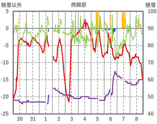 | 日 | 時 | 気温 | 降水 | 風向/風速 | 日照 | 積雪 | 降雪 |