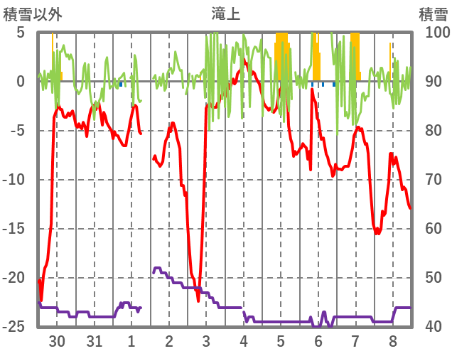| 日 | 時 | 気温 | 降水 | 風向/風速 | 日照 | 積雪 | 降雪 |