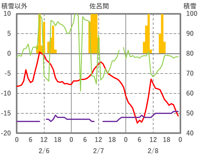 | 日 | 時 | 気温 | 降水 | 風向/風速 | 日照 | 積雪 | 降雪 |