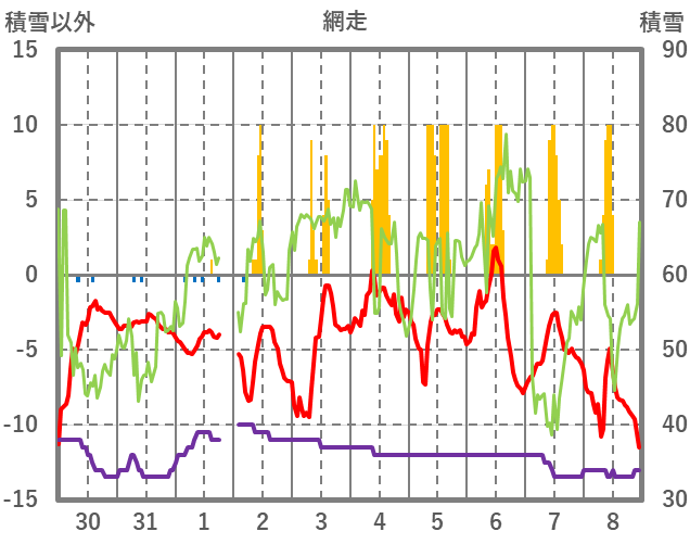 | 日 | 時 | 気温 | 降水 | 風向/風速 | 日照 | 積雪 | 降雪 |