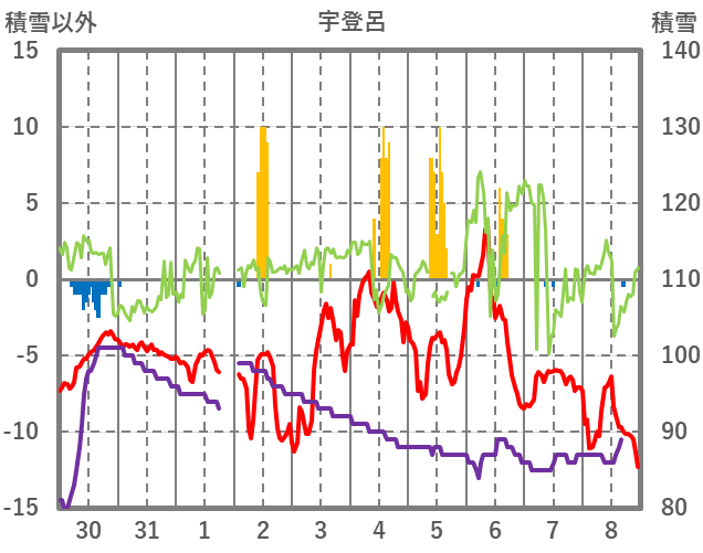| 日 | 時 | 気温 | 降水 | 風向/風速 | 日照 | 積雪 | 降雪 |