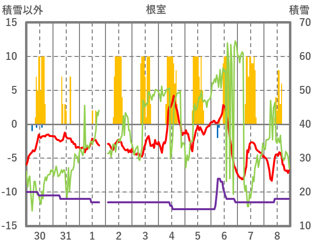 | 日 | 時 | 気温 | 降水 | 風向/風速 | 日照 | 積雪 | 降雪 |