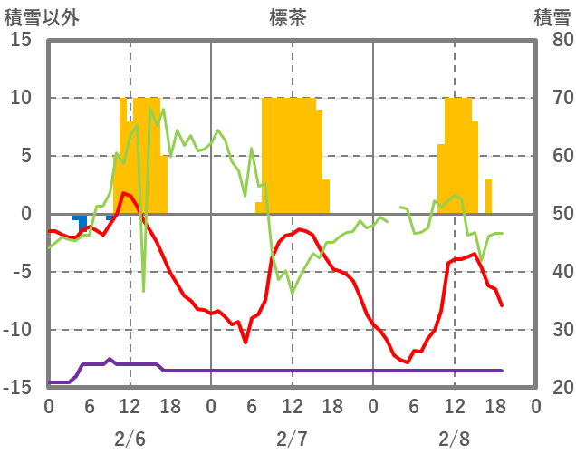 | 日 | 時 | 気温 | 降水 | 風向/風速 | 日照 | 積雪 | 降雪 |