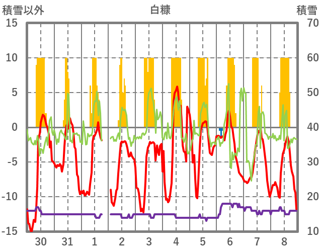 | 日 | 時 | 気温 | 降水 | 風向/風速 | 日照 | 積雪 | 降雪 |