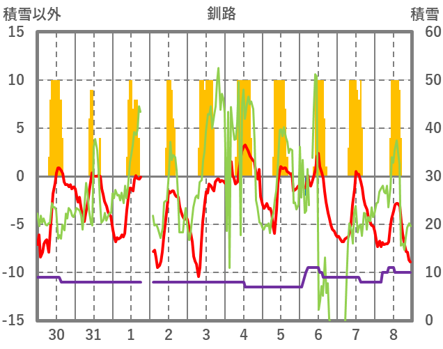 | 日 | 時 | 気温 | 降水 | 風向/風速 | 日照 | 積雪 | 降雪 |