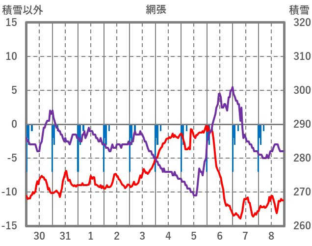 | 日 | 時 | 気温 | 降水 | 風向/風速 | 日照 | 積雪 | 降雪 |
