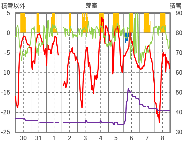 | 日 | 時 | 気温 | 降水 | 風向/風速 | 日照 | 積雪 | 降雪 |