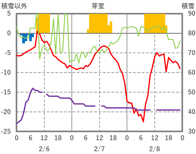 | 日 | 時 | 気温 | 降水 | 風向/風速 | 日照 | 積雪 | 降雪 |