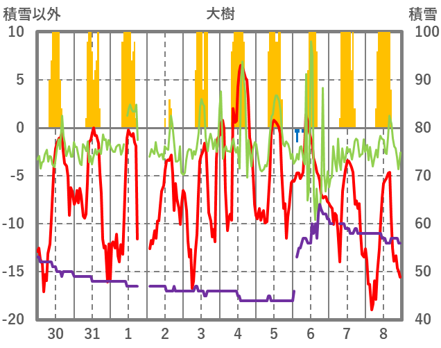 | 日 | 時 | 気温 | 降水 | 風向/風速 | 日照 | 積雪 | 降雪 |