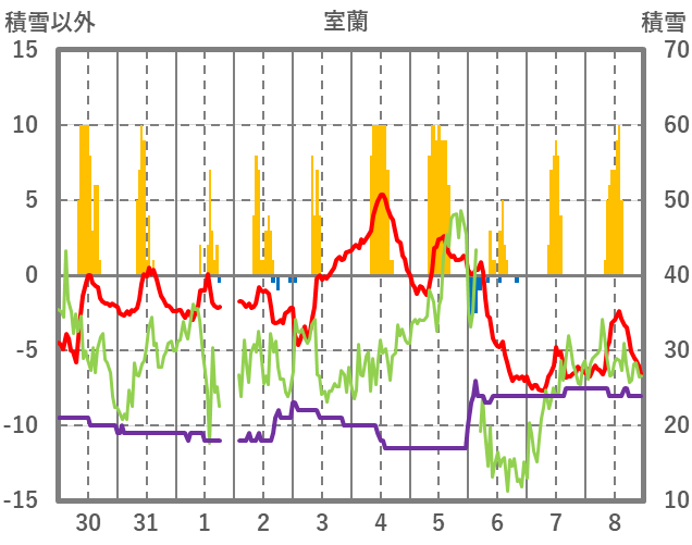 | 日 | 時 | 気温 | 降水 | 風向/風速 | 日照 | 積雪 | 降雪 |