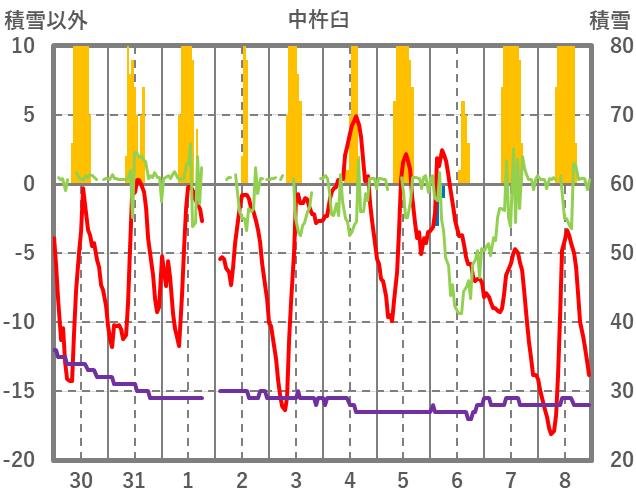 | 日 | 時 | 気温 | 降水 | 風向/風速 | 日照 | 積雪 | 降雪 |