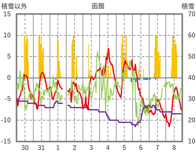 | 日 | 時 | 気温 | 降水 | 風向/風速 | 日照 | 積雪 | 降雪 |