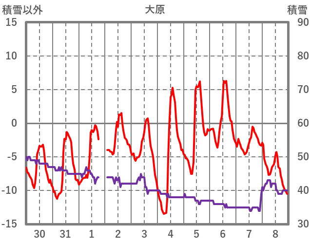 | 日 | 時 | 気温 | 降水 | 風向/風速 | 日照 | 積雪 | 降雪 |