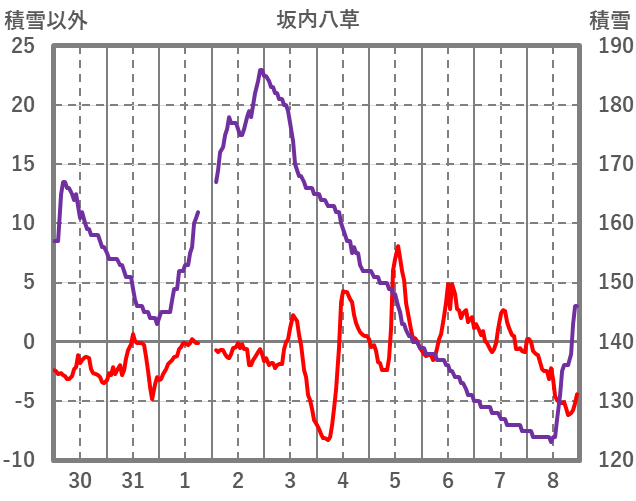 | 日 | 時 | 気温 | 降水 | 風向/風速 | 日照 | 積雪 | 降雪 |
