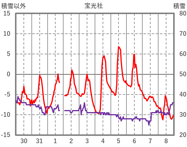 | 日 | 時 | 気温 | 降水 | 風向/風速 | 日照 | 積雪 | 降雪 |