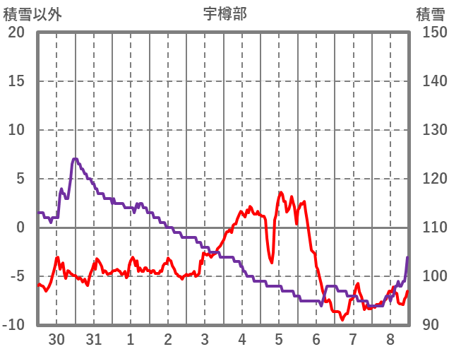 | 日 | 時 | 気温 | 降水 | 風向/風速 | 日照 | 積雪 | 降雪 |