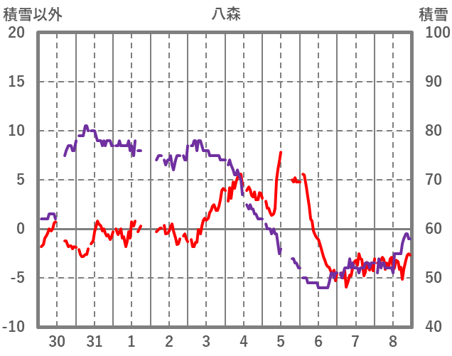 | 日 | 時 | 気温 | 降水 | 風向/風速 | 日照 | 積雪 | 降雪 |