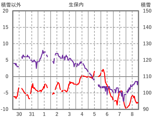 | 日 | 時 | 気温 | 降水 | 風向/風速 | 日照 | 積雪 | 降雪 |
